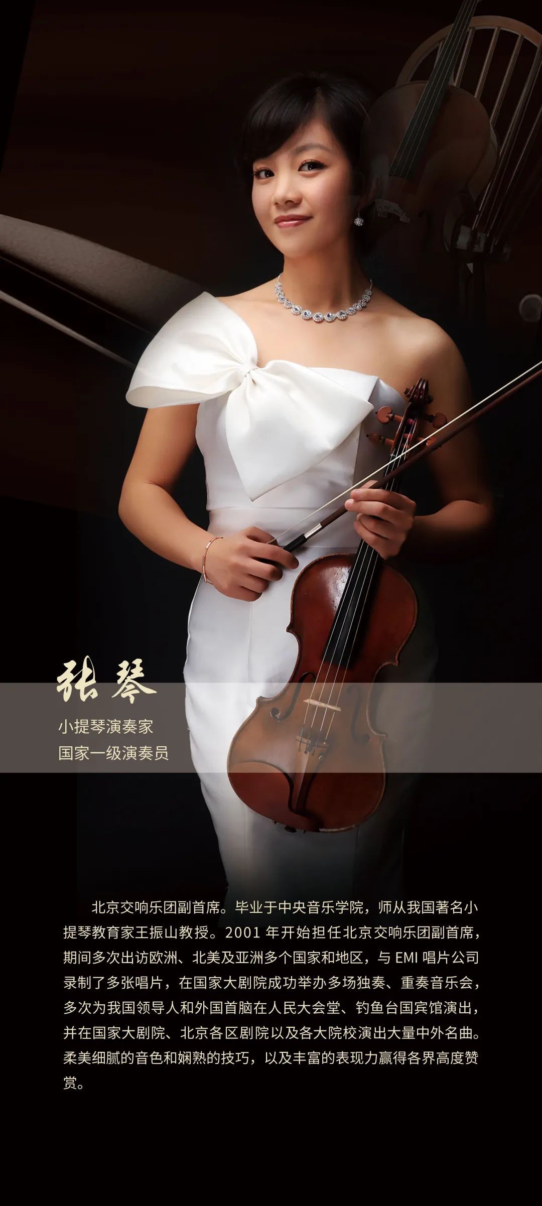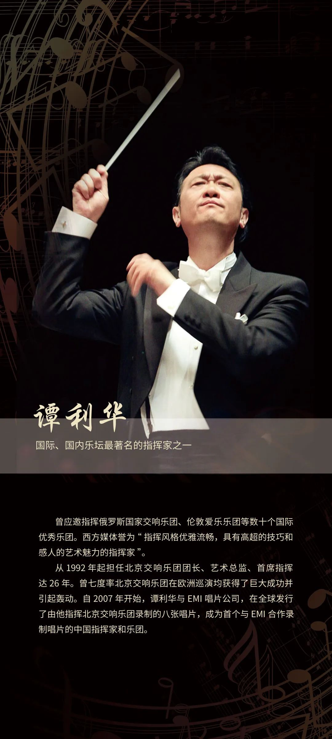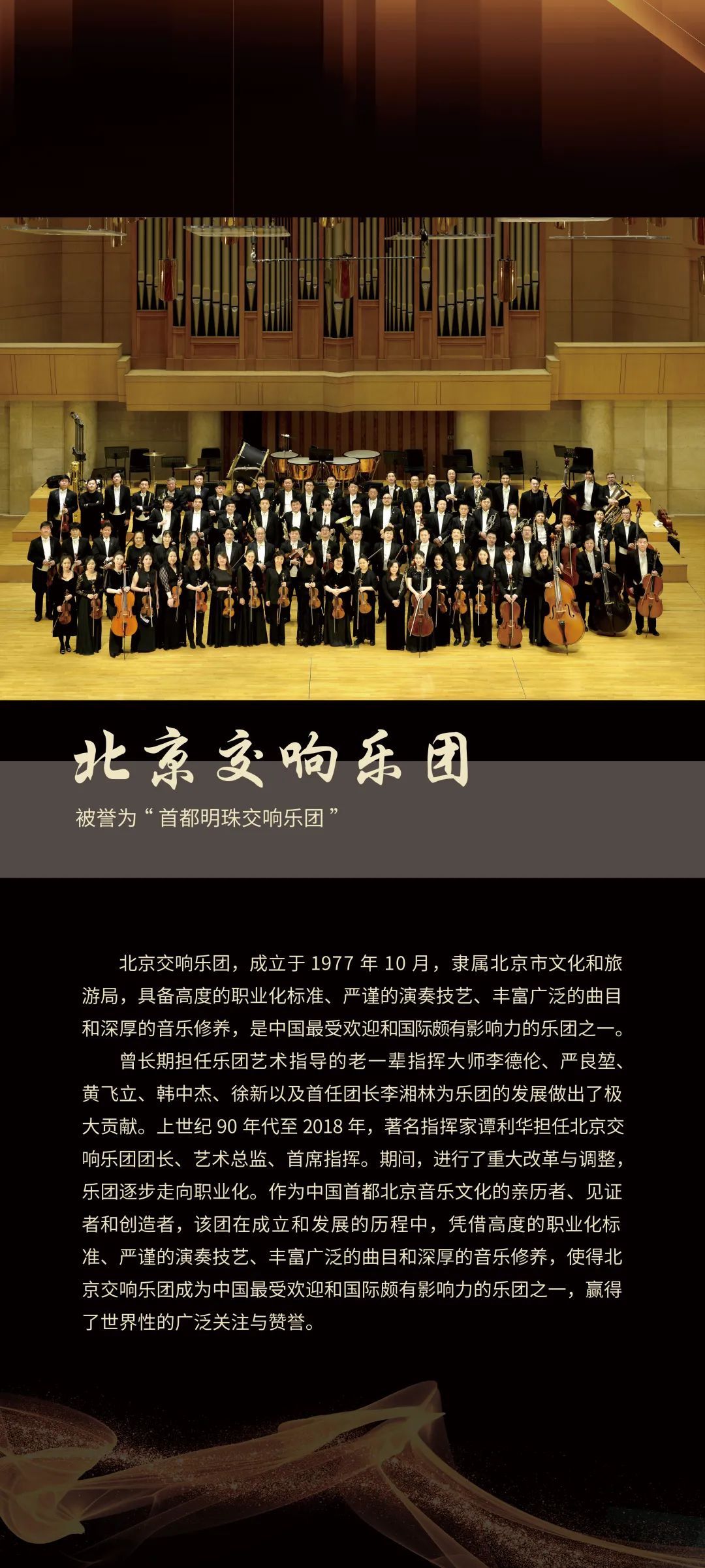 活动特邀有着“首都明珠交响乐团”美誉的北京交响乐团献上精彩演出,由活跃在国际、国内乐坛的著名指挥家谭利华执棒音乐会,小提琴演奏家、国家一级演奏员张琴担任音乐会首席。