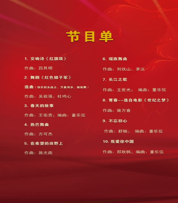 本场音乐会精选红色主题歌曲,将为观众带来一场高水平的音乐盛宴。通过艺术家们的精彩演绎,带领观众重温光辉岁月,用音乐的语言表达对祖国繁荣昌盛的自豪与祝福,感受那份属于中华民族的骄傲与自豪。