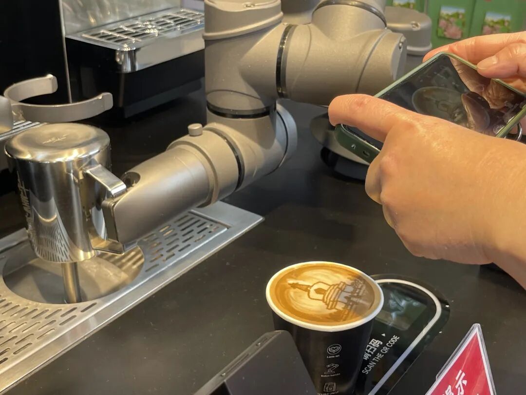 华熙LIVE·五棵松广场的同款太空舱机器人,除了售卖零食、饮料、文创商品外,还负责运送机械臂制作的现磨咖啡。现场同样配备了工作人员。记者下单体验后看到,机器人将咖啡送至柜台时,工作人员会立刻上前扶稳杯身,防止机器人动作过猛,将咖啡洒出。