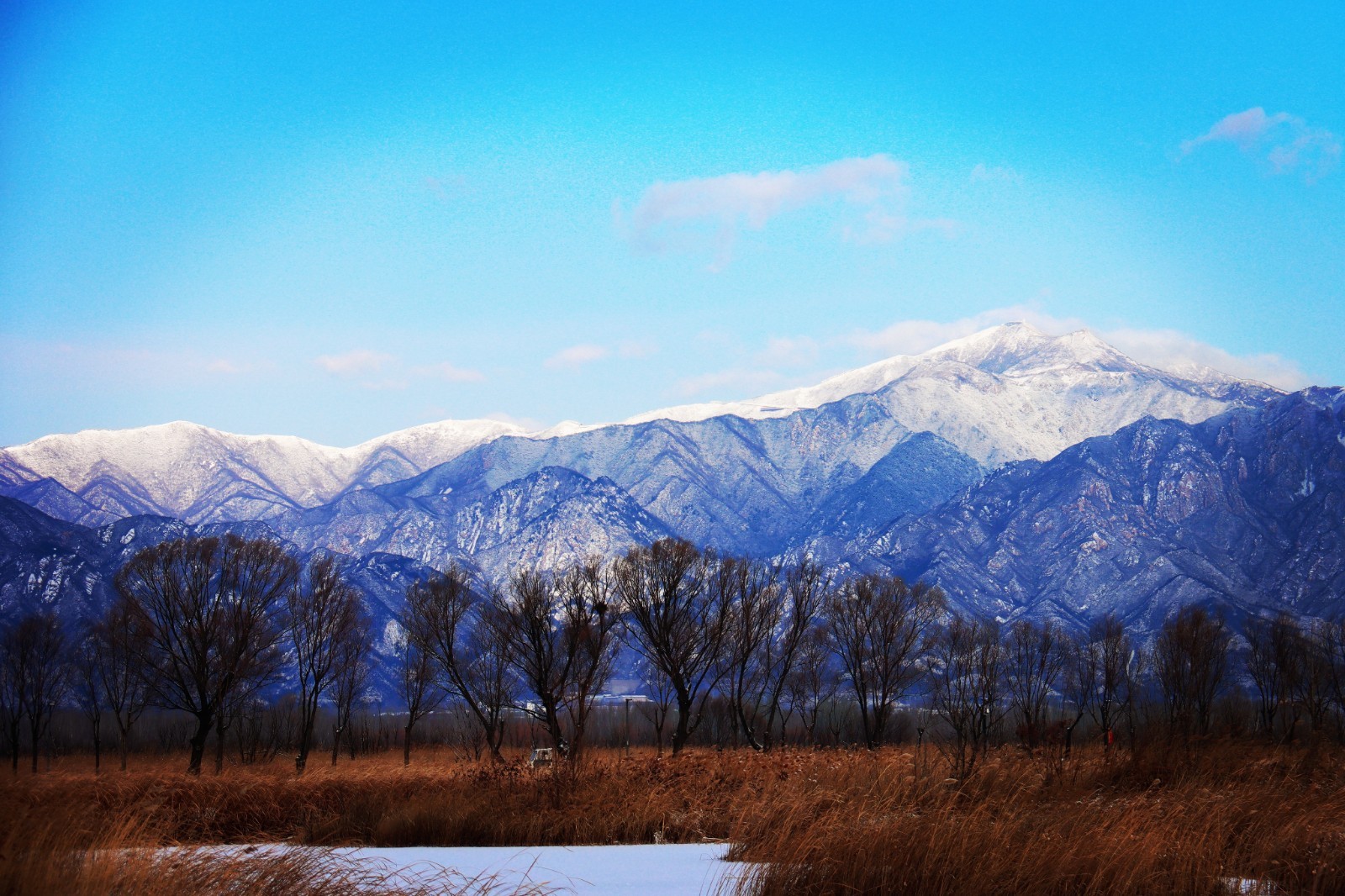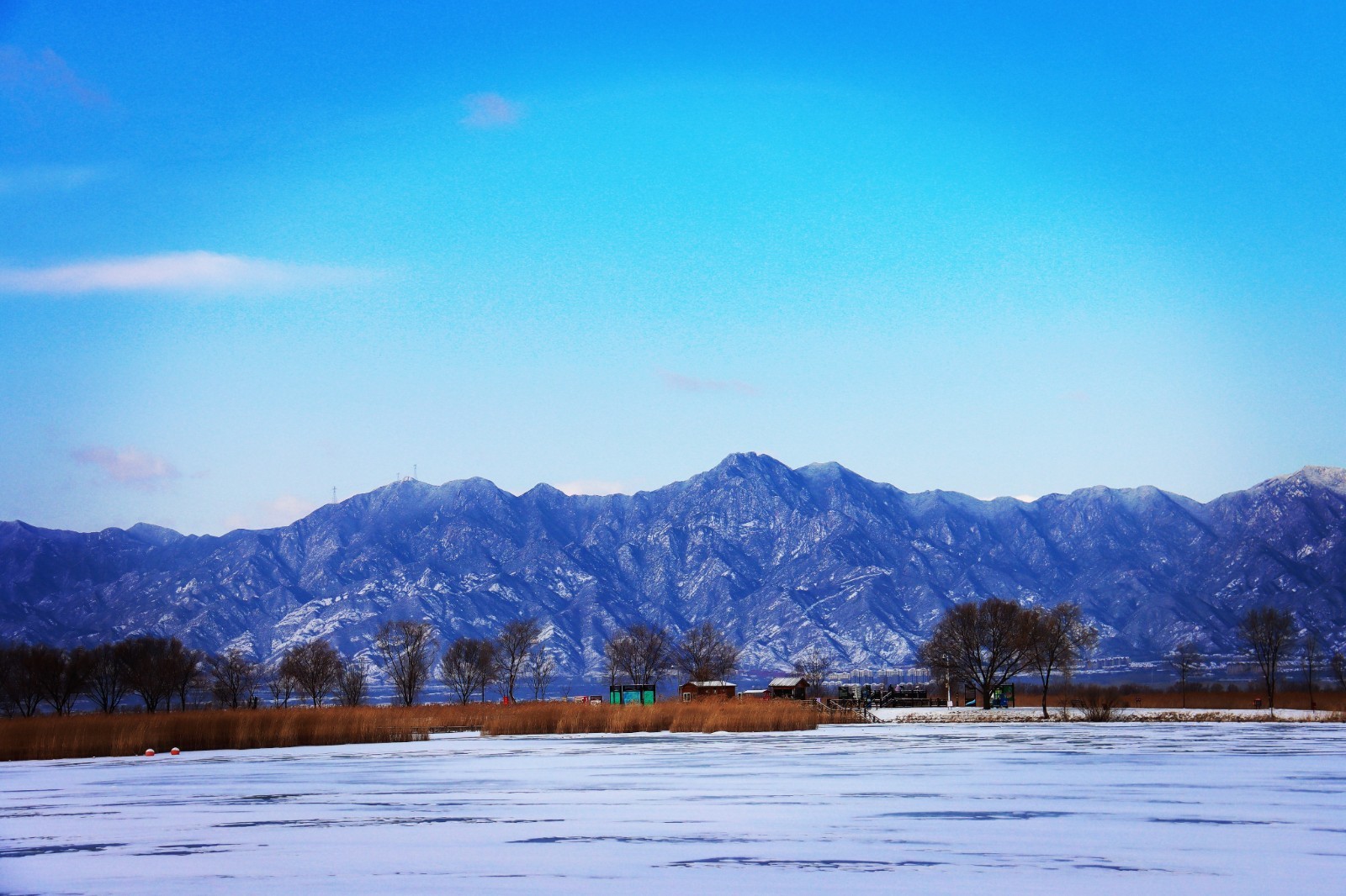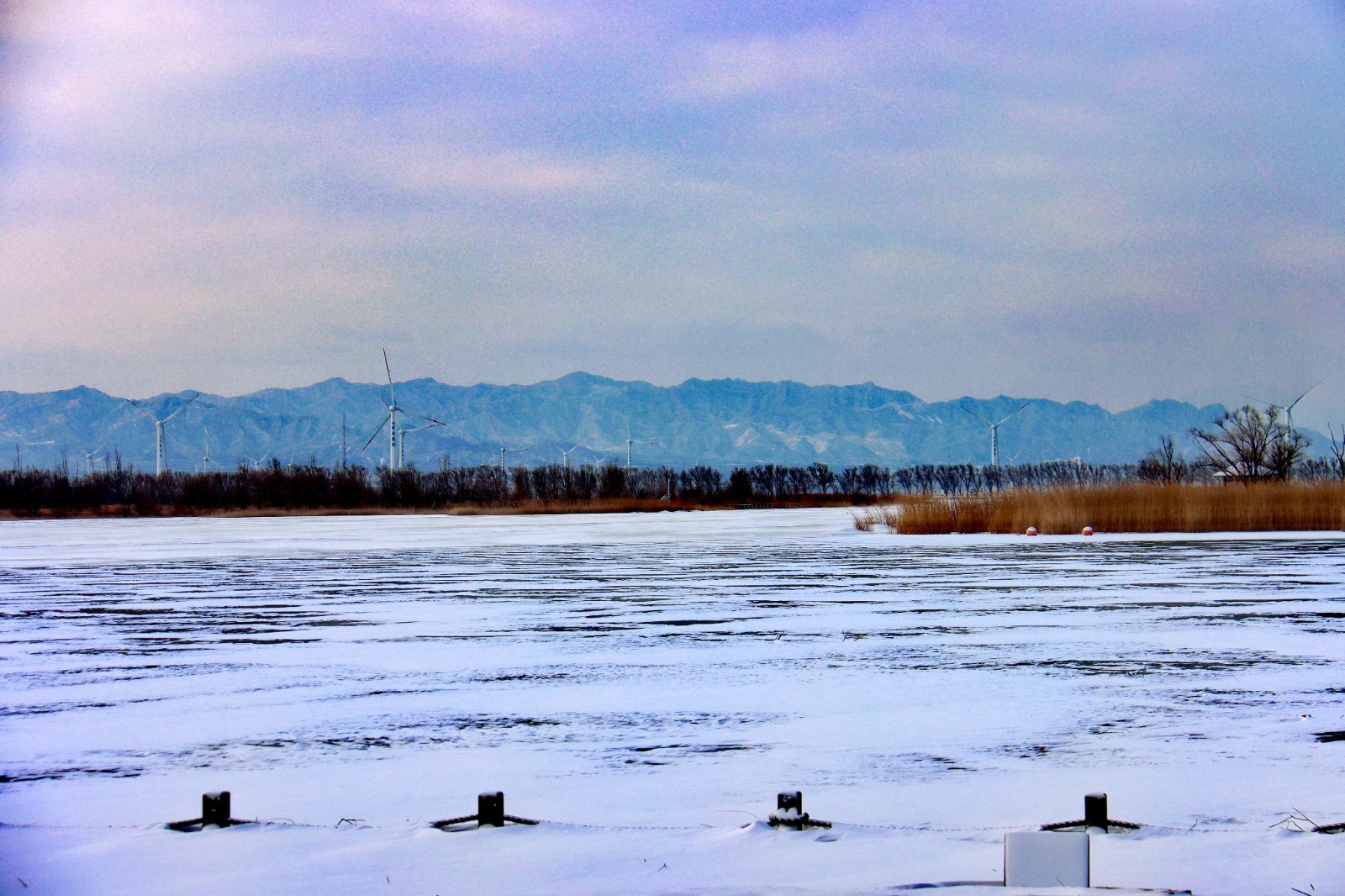 当雪花栖息于芦苇的末梢,野鸭湖湿地便退去斑斓,凝成一片空灵缥缈的琉璃世界。
