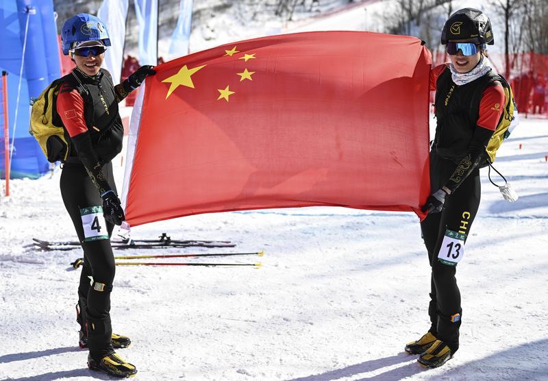 2月9日,中国选手次旦玉珍(左)与队友于婧萱庆祝。次旦玉珍获得冠军,于婧萱获得亚军。当日,第九届亚冬会滑雪登山女子短距离决赛在亚布力举行。新华社记者 谢剑飞 摄