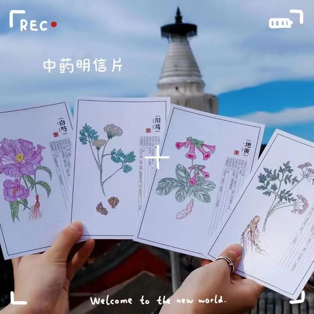 四物汤的四种药材分别被印在了明信片上,不仅手绘了原植物和用药部位,标注着功能主治、用法用量等信息,还在背面用不同颜色区分了药性的温热寒凉,从前觉得高深的中草药知识一下子就有了更具象的记忆。