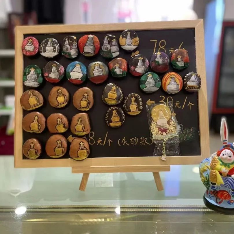 冰箱贴做成了寓意健康长寿的葫芦形状,上面是白塔寺最有代表性的鸽影浮图场景,下面围着玉兰花。随冰箱贴附赠的,还有两颗辛夷原药材。科普一下, 辛夷其实就是常见的玉兰,它可以入药,具有通鼻腔的功效。把它贴在冰箱上,顿时多了一分精通药理的蜜汁自信。