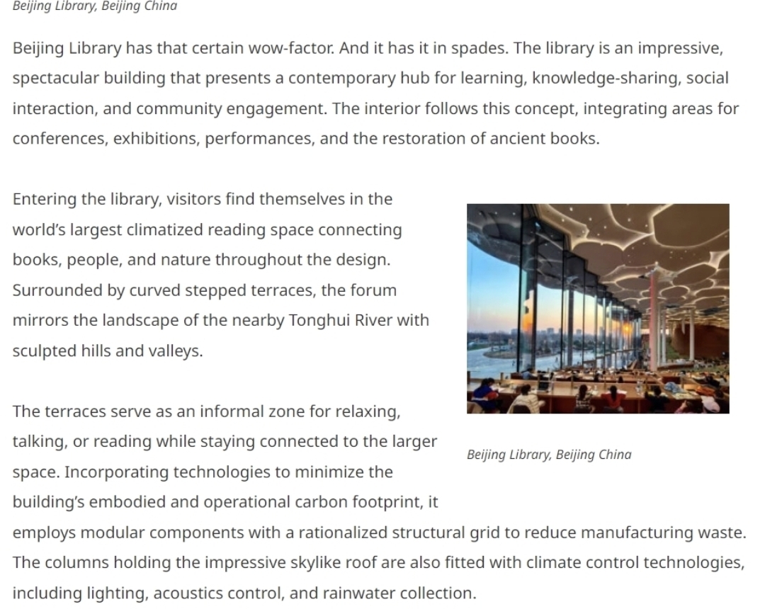评审团表示:“这里确实让人眼前一亮,而且震撼感十足。这座图书馆建筑令人印象深刻,壮观无比,展现出一个集学习、知识共享、社交互动和社区参与为一体的现代化中心。内部设计秉承这一理念,融合了会议、展览、表演和古籍修复等多个功能区域。进入图书馆,参观者将置身于全球最大的恒温阅读空间,这一设计通过将书籍、人和自然相连接,营造出独特的阅读体验。由弧形阶梯式露台环绕的大厅,仿佛再现了附近通惠河的地貌,呈现出雕刻般的丘陵和山谷。这些露台为放松、交谈或阅读提供了一个非正式的区域,同时保持与整个空间的连接。图书馆采用技术手段来最大限度地减少建筑的碳足迹,包括使用模块化组件和合理化的结构网格以减少制造废料。支撑壮观的天空般屋顶的柱子也配备了气候控制技术,包括照明、声学控制和雨水收集系统。”