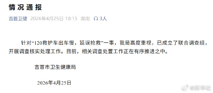 据吉首市卫生健康局通报:针对“120救护车出车慢,延误抢救”一事,我局高度重视,已成立了联合调查组,开展调查核实处理工作。目前,相关调查处置工作正在有序推进之中。