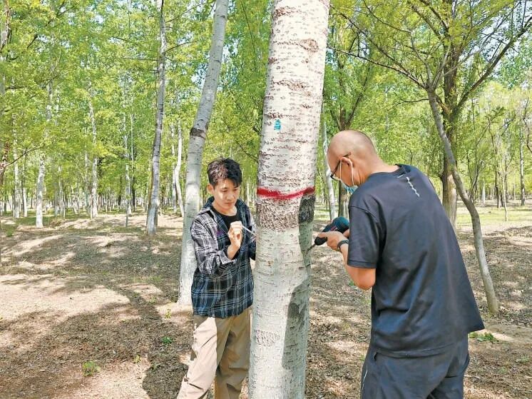 科研人员给树干打孔放入抑制剂,治理飞絮问题/来自北京日报