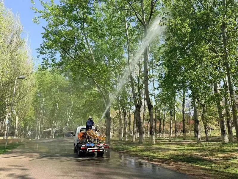 园林工人向飞絮树种喷施凝絮剂,降低飞絮影响/记者拍摄