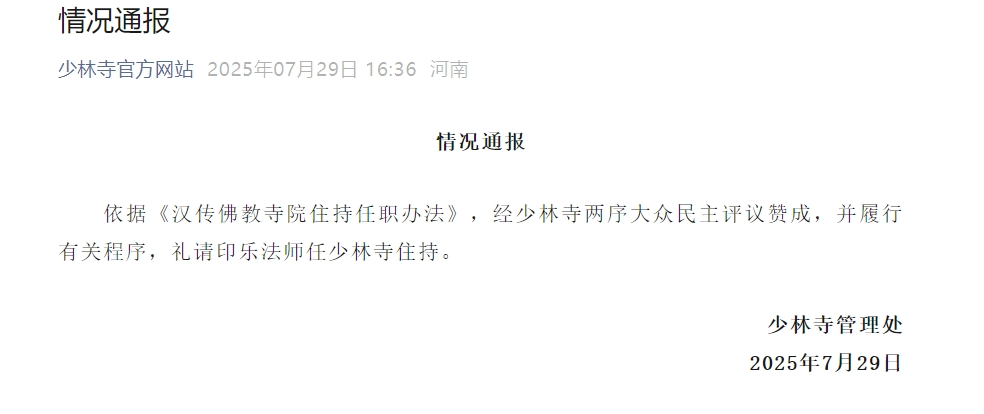 7月29日下午,“少林寺官方网站”微信公号发布一则情况通报:依据《汉传佛教寺院住持任职办法》,经少林寺两序大众民主评议赞成,并履行有关程序,礼请印乐法师任少林寺住持。