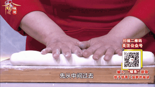 擀饺子皮:将提前饧发好的面团,从中间往两面揉成长条,揪出面剂子按压成面饼,用擀面杖先擀面饼3/4处擀下去后往回拉,转面然后擀1/2处往下拉,再转2次擀剩下的1/3处即可。