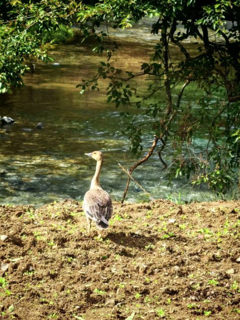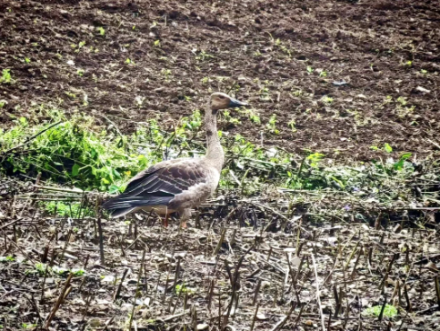 此次拍摄到的豆雁体型健硕,上体呈灰褐色且带有淡黄白色羽缘,下体呈污白色。它最具标志性的黑褐色嘴部带有鲜明橘黄色带斑,与橙黄色蹼足相映成趣,物种特征十分典型。这只豆雁独自在开阔草地从容觅食,周边植被茂密、水源充沛,为其提供了适宜的栖息环境。经确认,该豆雁属于冬候鸟种群,此次现身恰逢其南迁越冬的关键时段,进一步印证了十八里长峡在候鸟迁徙路线中的重要生态地位。