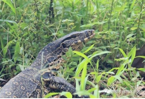 科研人员在跟踪拍摄过程中,圆鼻巨蜥感受到了威胁,随即摆出防守姿态,不断地吐舌头。经工作人员观察,此圆鼻巨蜥无受伤迹象,进食正常,可以直接让其回归大自然。