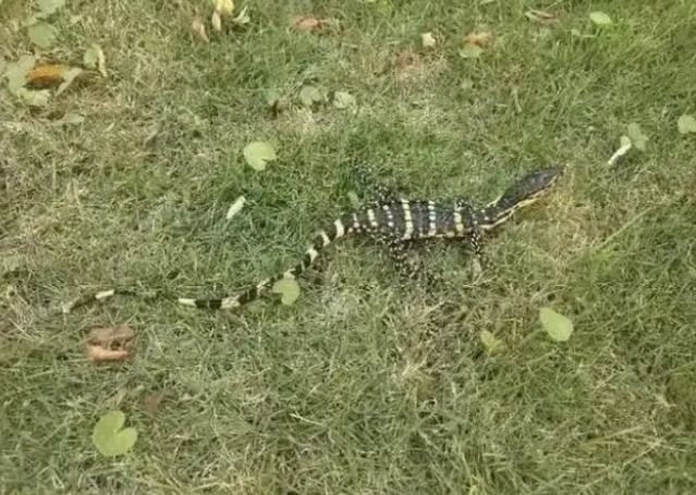 圆鼻巨蜥(Varanus salvator)是我国国家一级保护野生动物,属蜥蜴目巨蜥科爬行动物,栖息于山区的溪流附近或沿海的河口、山塘、水库等地,主要分布在南亚和东南亚一带,我国的广东、广西、海南、云南等地均有分布。圆鼻巨蜥一般身长1米到2米,最大的可达2.5米,幼体亦长300毫米以上,头小窄长,颈长,舌长,尾长而侧扁,鼻孔圆形或椭圆形,体重可达20千克至30千克,因为身上长有黄色斑纹,又称“五爪金龙”,其寿命可达150年。