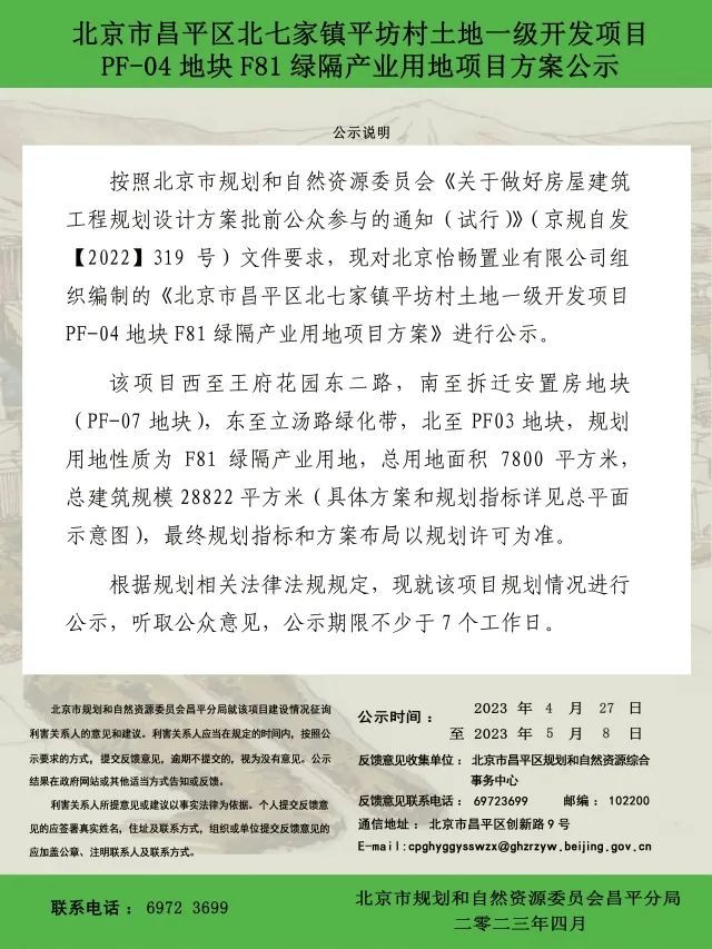 按照北京市规划和自然资源委员会《关于做好房屋建筑工程规划设计方案批前公众参与的通知(试行)》(京规自发【2022】319号)文件要求,现对北京怡畅置业有限公司组织编制的《北京市昌平区北七家镇平坊村土地一级开发项目PF-04地块F81绿隔产业用地项目方案》进行公示。