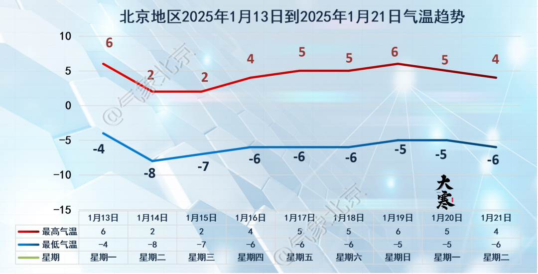 14 日(周二)白天:晴;偏北风 4 级左右;平原地区最高气温 2℃,山区最高气温-4~2℃。