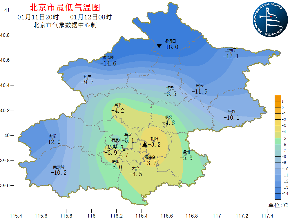 1月11日20时至12日08时,南郊观象台最低气温-3.7℃(11日21:44)