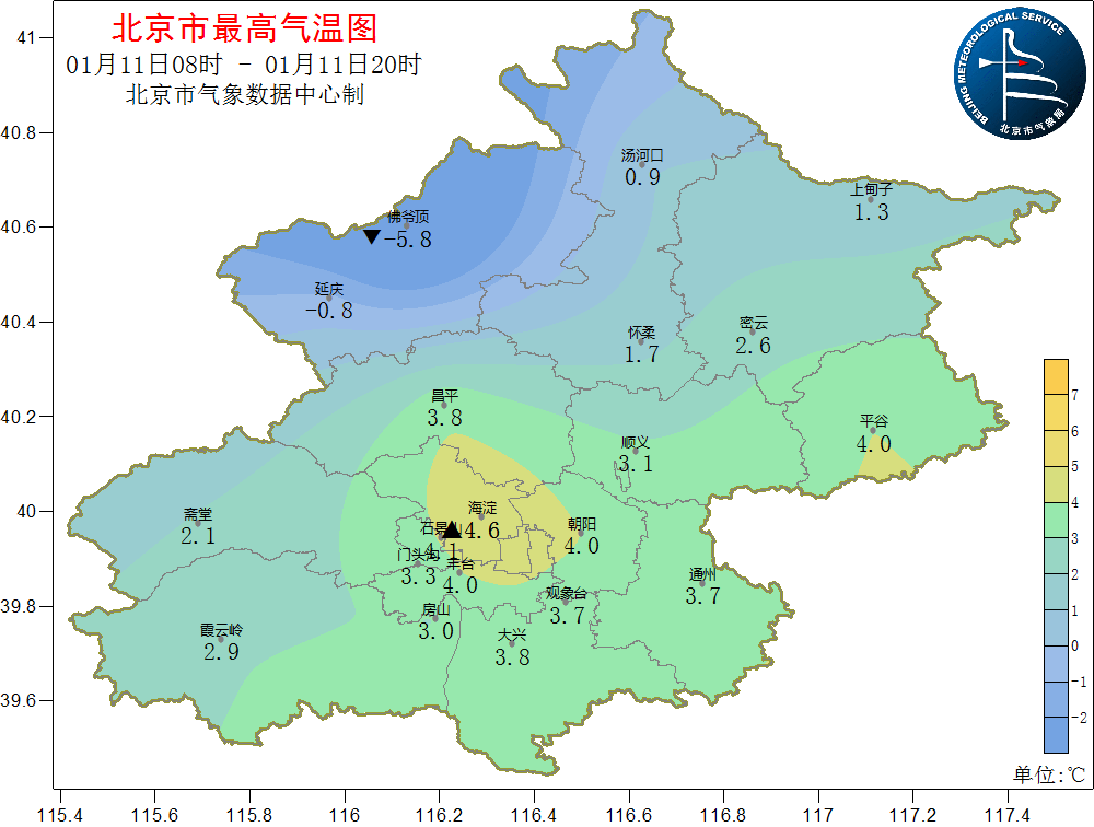 1月11日08时至20时,南郊观象台最高气温3.7℃(11日15:05)