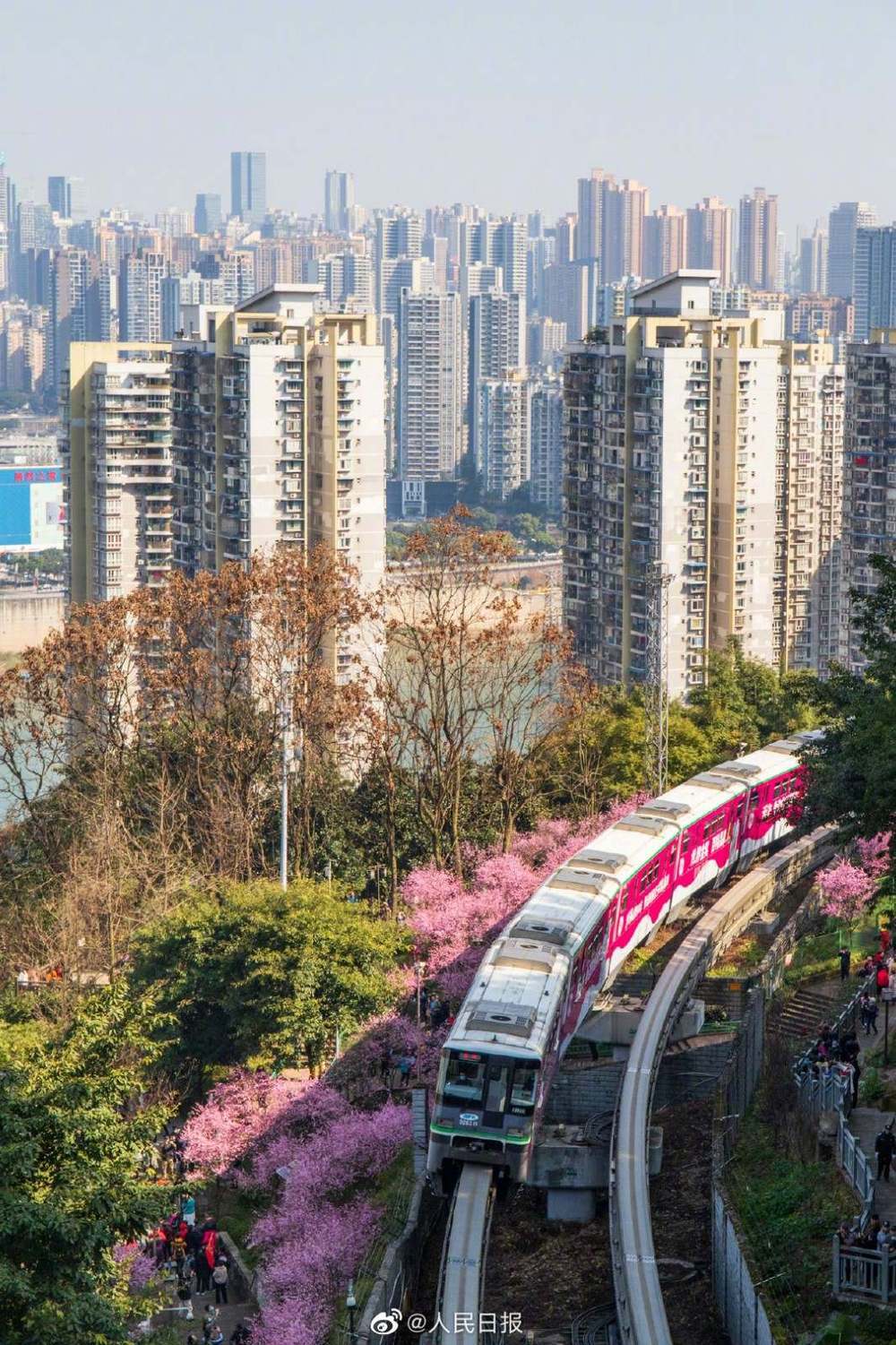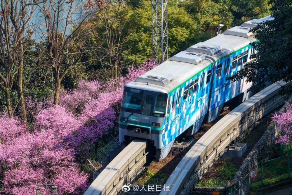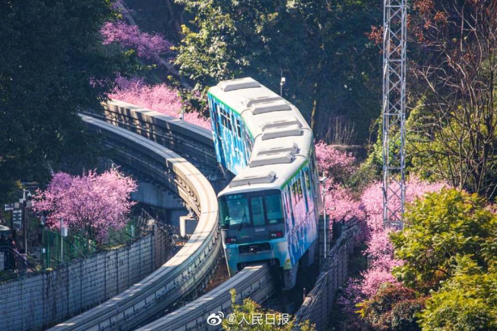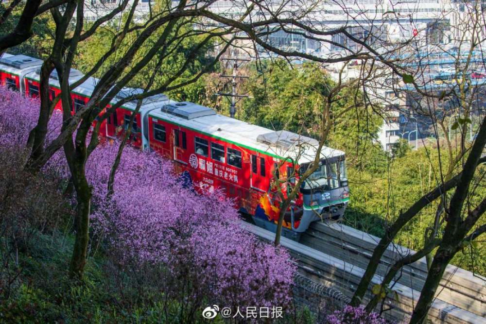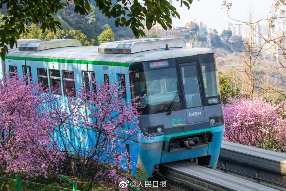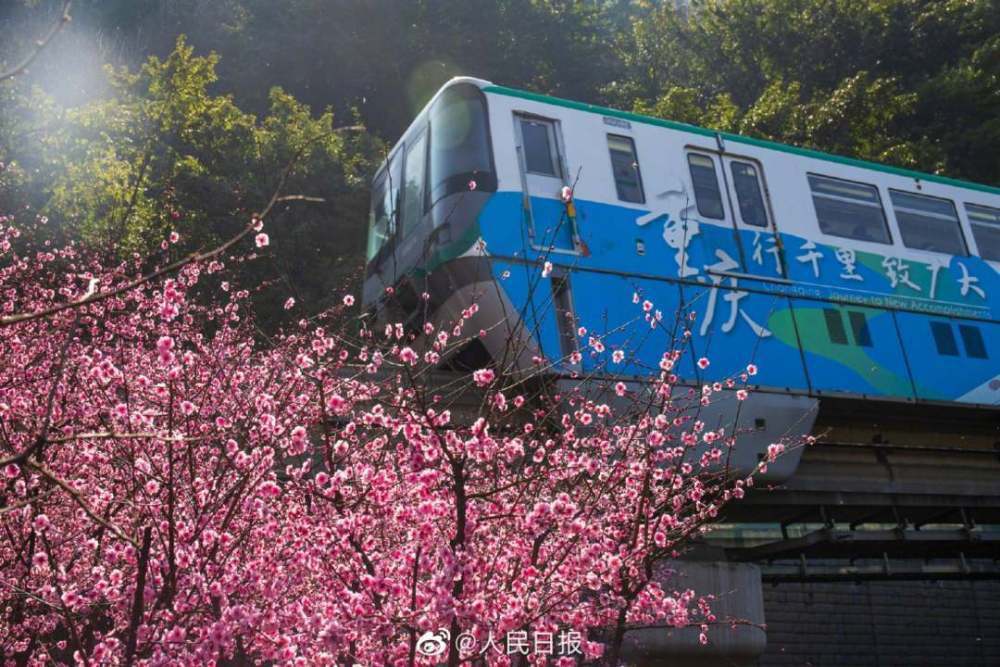 2月23日,重庆佛图关公园阳光明媚,美人梅争相开放,充满春天的气息。重庆轨道交通2号线穿行在花海中,正如开往春天的列车。