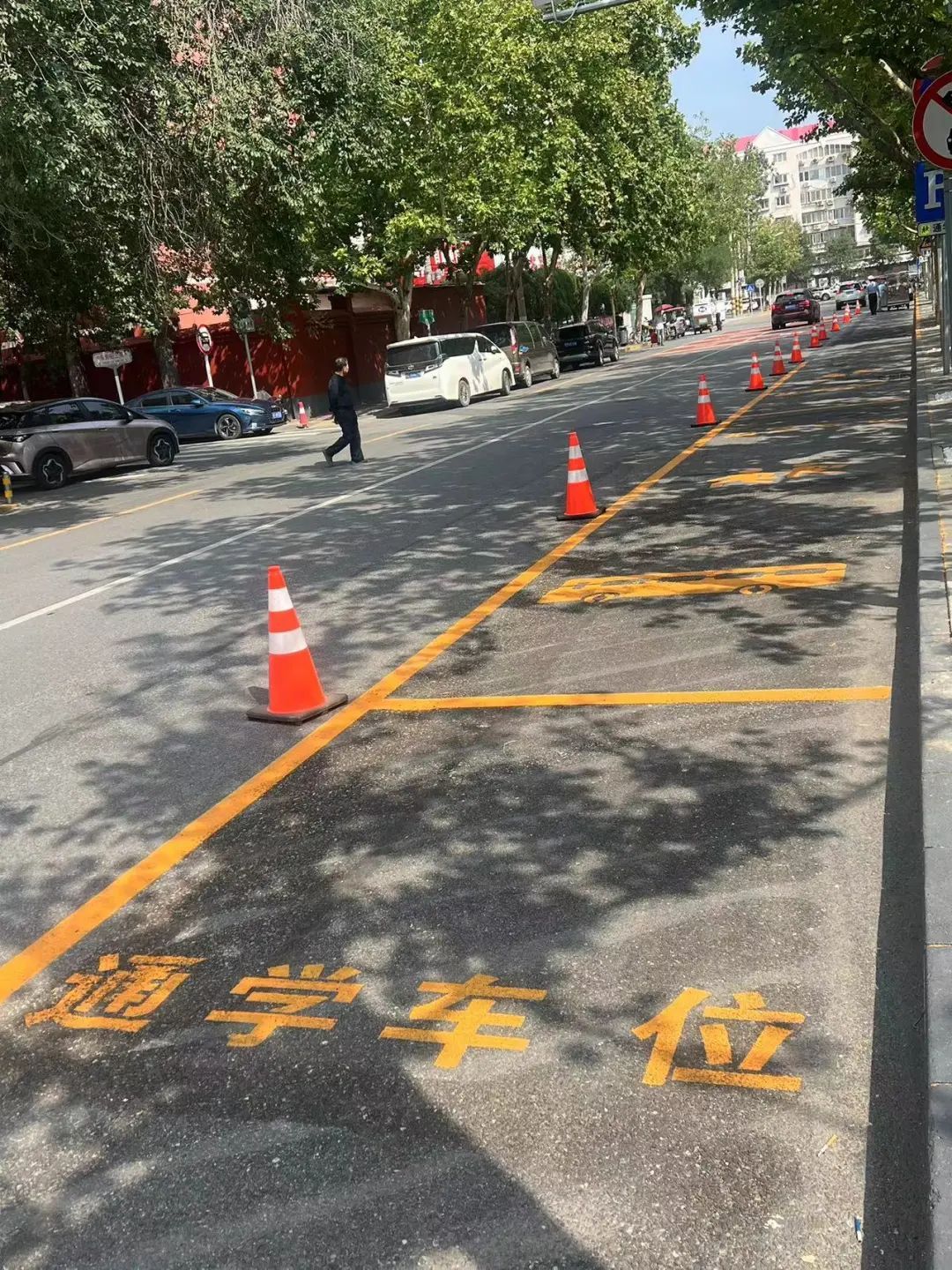 9月开学,丰台区第一小学门前有了新变化,过去路边十余个小客车停车位清除后,施划上了通学公交专属车位——黄色边框内,喷涂了大客车、儿童图标以及“通学车位”字样。