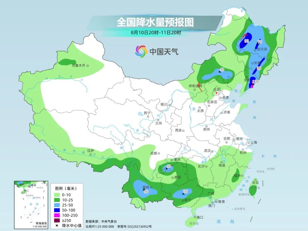 明天夜间到后天,黑龙江西部和中部、吉林中部、辽宁东部等地部分地区有暴雨或大暴雨。
