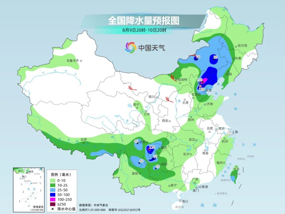 具体来看,今天夜间到明天,内蒙古中东部、河北中北部、北京、天津、黑龙江西南部、吉林西部、辽宁中西部、四川中南部、重庆西南部、贵州西部等地部分地区有大到暴雨,其中,河北东北部、北京东北部和西南部、四川盆地南部等地局地有大暴雨。