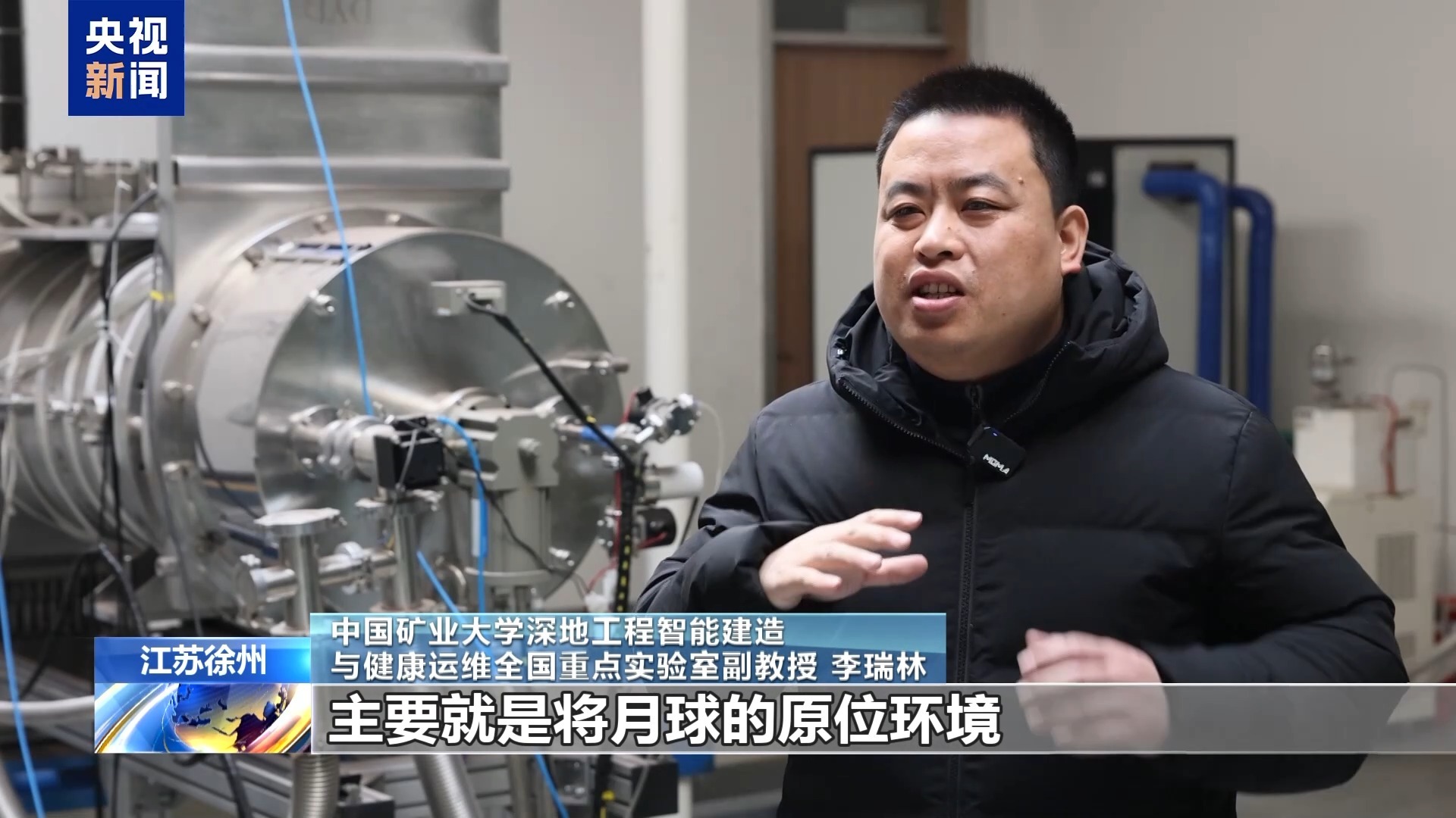中国矿业大学深地工程智能建造与健康运维全国重点实验室副教授 李瑞林:将环境模拟出来以后,我们再采用和月壤性质相似的模拟月壤,将月球地层的特性高保真重现出来。实际上它就是跟月球上基本一致的状态。这时候我们再去做实验,实际上跟月球上的数据是接近的。