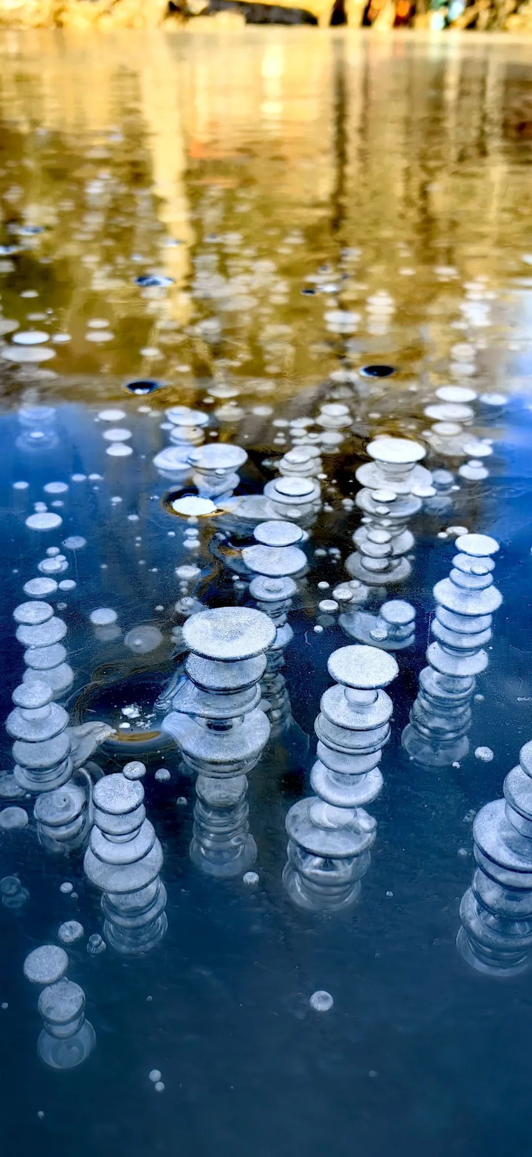 桃源仙谷里,比冰瀑更出圈的是它美得冒泡的气泡湖,有京郊“贝加尔湖”的美名。冰面布满纵横的裂纹、随处可见的幽蓝小气泡,仿佛置身贝加尔湖,如梦似幻。