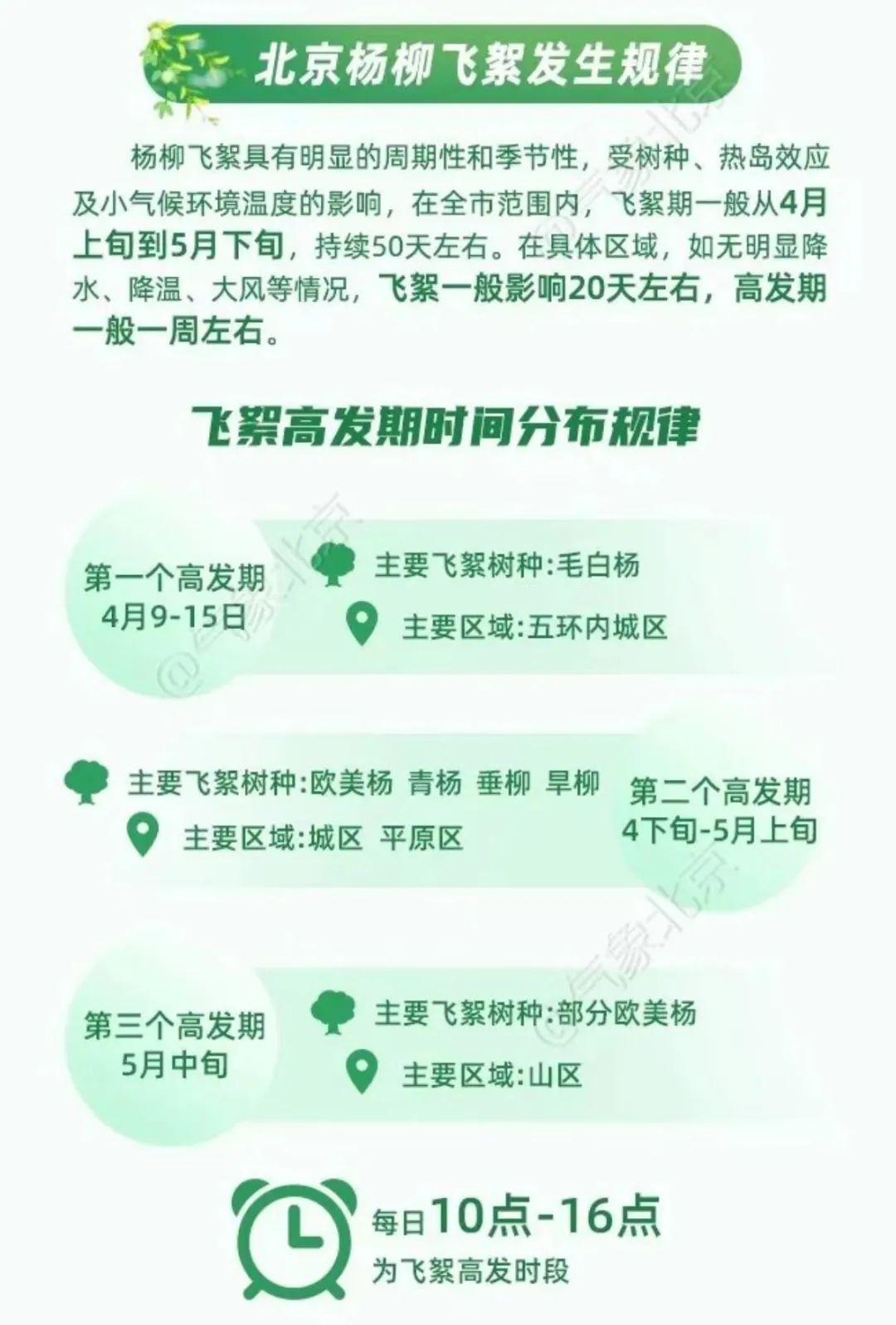 此外,可登陆中国气象网网站或气象北京微信查询杨柳飞絮预报,提前做好防护。