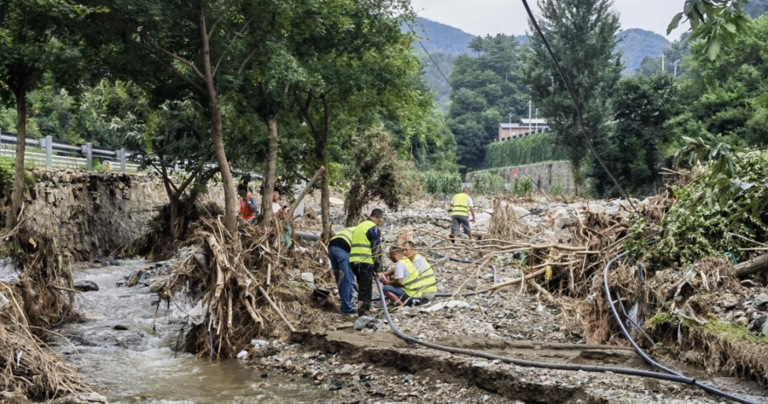 得田沟村取水泵房周边道路被洪水冲毁,自来水集团抢险队员迅速清理泵房地面和设备上的淤泥。之后细致排查供电、消毒和水电机泵等情况,制定修复计划、调集设备物资,通过近10个小时的连续作业完成修复工作。与此同时,城建集团完成管网修复,实现了通水到户。