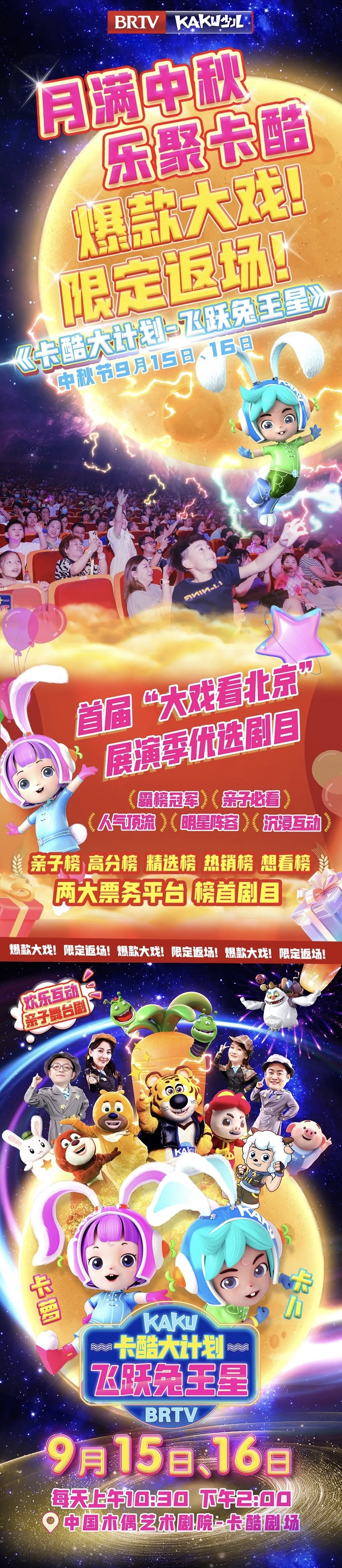 火爆开票|《卡酷大计划之飞跃兔王星》中秋节奔月专场,年度限定!国潮+童话!中秋浪漫亲子剧,“卡酷大计划”带你去月球!各大票务平台火热售票中!更有亲子优惠哦!演出时间:9月15日-16日每天10:30/14:00。演出时长:80分钟。演出地点:中国木偶艺术剧院卡酷剧场。