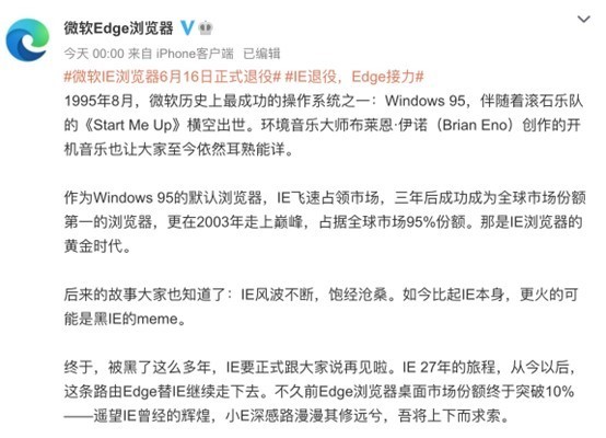 微软Edge浏览器官方宣布,微软在1995年推出的IE浏览器,将于6月16日正式退役,之后其功能将由Edge浏览器接棒。