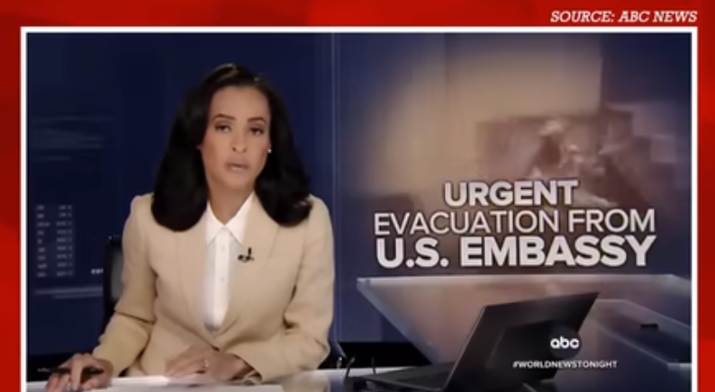 安柏然所发视频中,一名美媒主持人报道美国在夜间出动直升机撤离美国外交官的画面。
