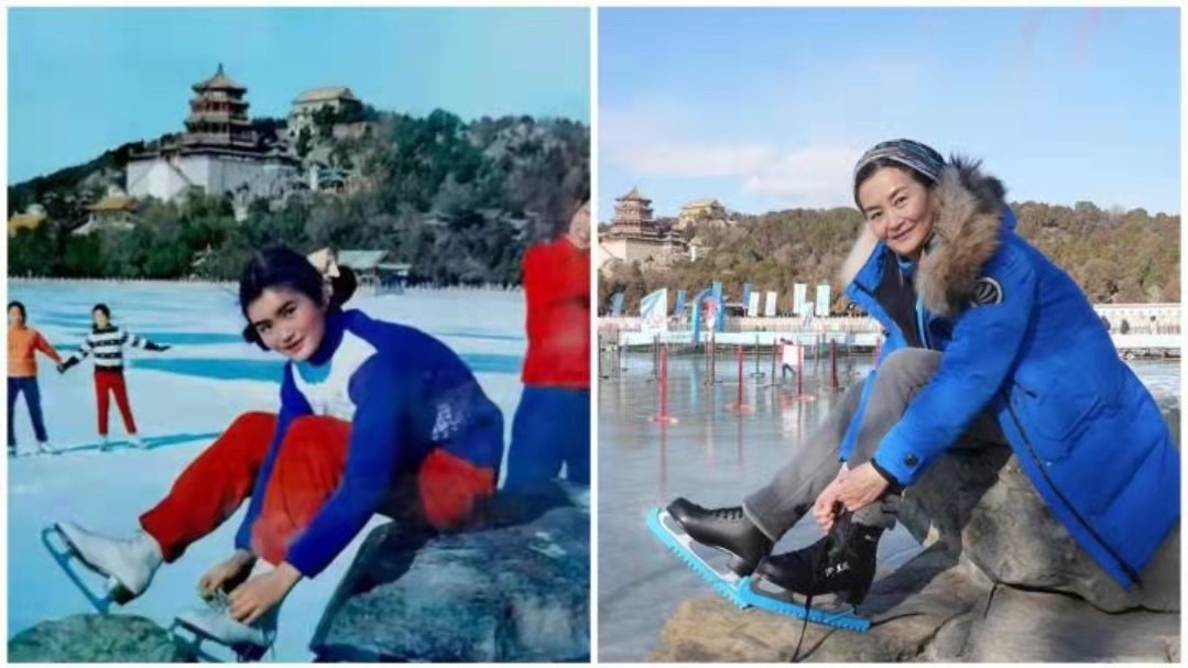 拼版照片。上图:年轻时的曲薇在颐和园昆明湖冰场边系冰鞋。下图:1月10日,曲薇在颐和园昆明湖冰场边系冰鞋。