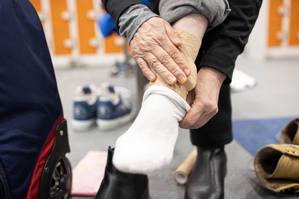 2021年12月16日,曲薇在滑冰前缠住自己的脚踝。