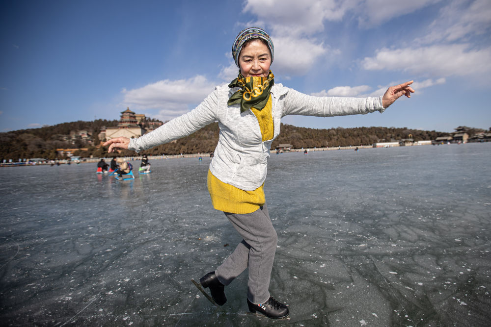67岁的曲薇,时隔二十年,在昆明湖上再次表演起了曾经的冰上舞蹈。一旁在冰车上嬉戏的年轻姑娘和小伙子们不禁驻足,看着舞姿入了神。仿佛那些年,昆明湖畔,观看“冰上公主”舞姿的观众们一样。