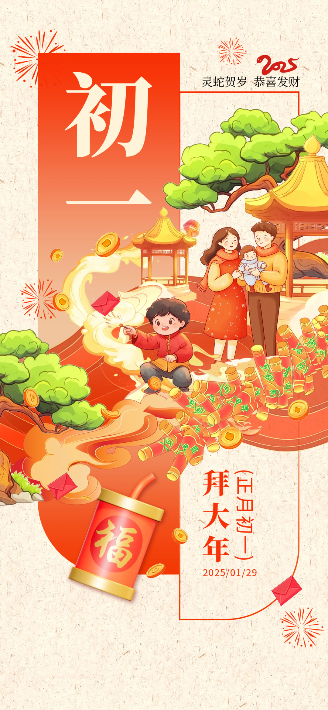 初一早晨,人们早早起床,打扮整齐,出门走亲访友,相互拜年,恭祝新年。拜年时,晚辈要先给长辈拜年,祝长辈长寿安康,长辈可将事先准备好的压岁钱分给晚辈。据说压岁钱可以压住邪祟,因为“岁”与“祟”谐音,晚辈得到压岁钱就可以平平安安度过一岁。