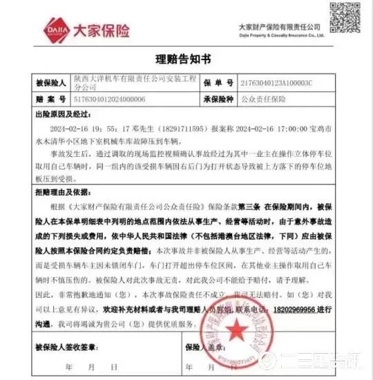 近日,陕西大洋机车有限责任公司负责处理此事的工作人员表示,一开始保险公司认可车损情况,并已经进行理赔程序,后来因保险公司在核保的时候发现,该事故不属于车库自身故障,因此拒绝理赔。该工作人员坦诚自己是三月底接到保险公司拒赔信息的,一直没有跟董先生说,是因为公司和保险公司一直在交涉,希望保险公司按照承诺尽快理赔,为此公司也投诉了大家保险公司好几次。