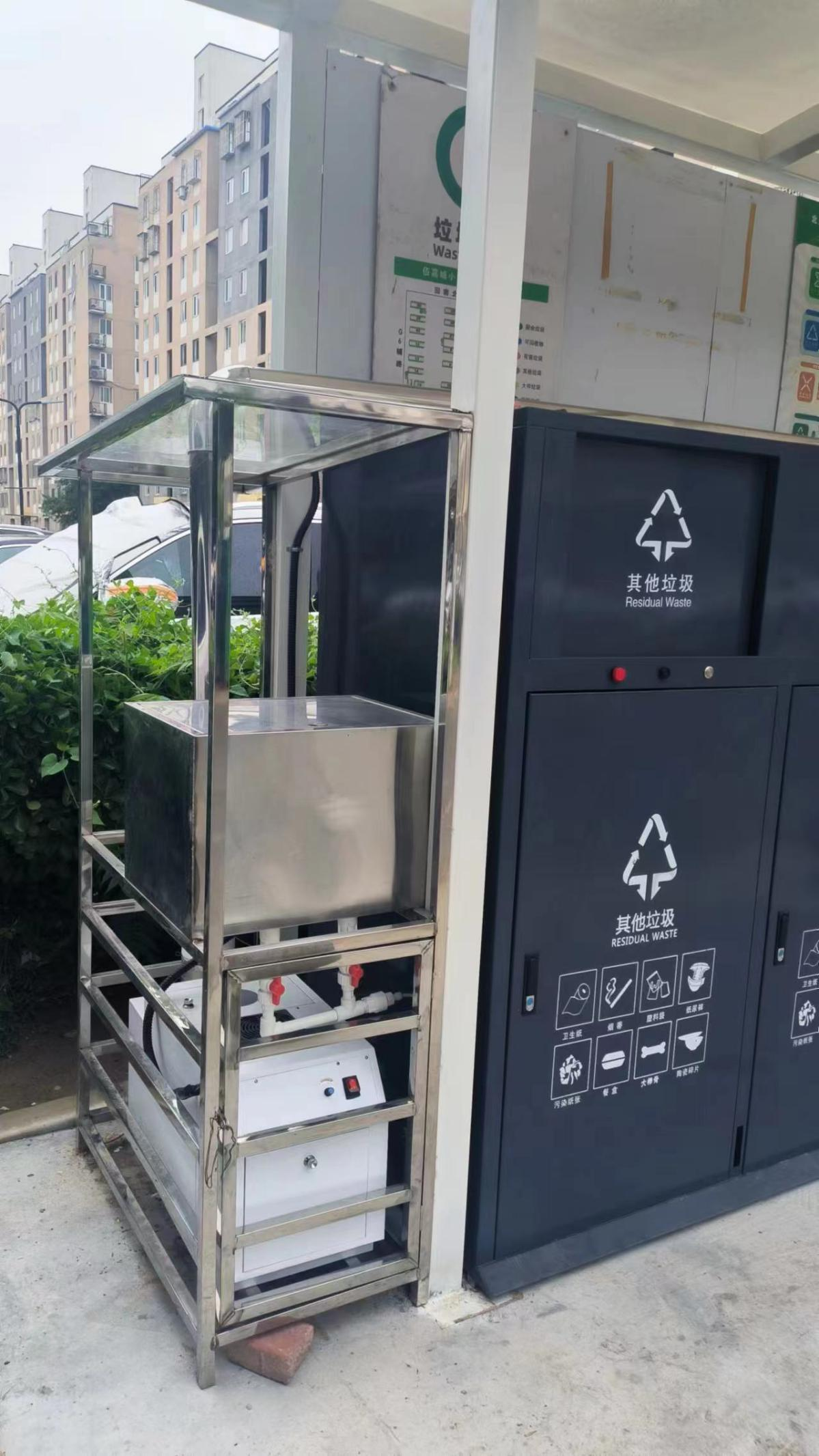 “这种构造让垃圾不外露的同时,也为保洁人员提供了休息的场所,解决了可回收物堆放的问题。”龙泽园街道相关负责人介绍,新投入的密闭桶站和分类驿站配备了超声波自动消杀系统,采用定时雾化消毒系统,每小时定时定点对整个桶站、驿站进行一次消杀,起到除味、消毒、降温、降尘的作用。每个密闭桶柜的上方还设置了雾化喷头,对垃圾桶进行消杀。消杀期间不影响居民正常使用。