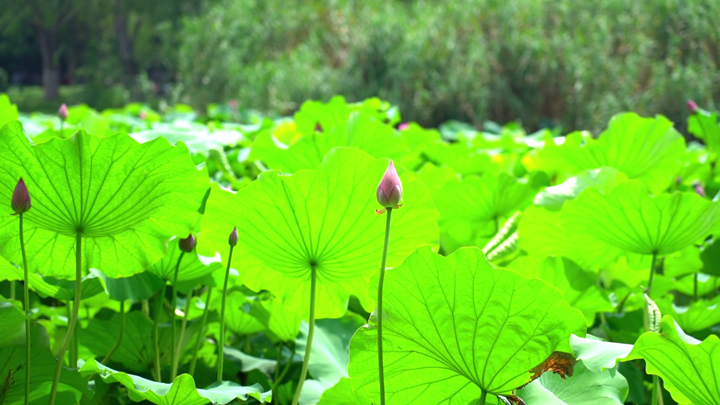 最近,在市区荷花池公园,碧绿的莲叶在阳光的映照下,构成了一幅生动的夏日画卷,为市民游客带来了一丝清凉。