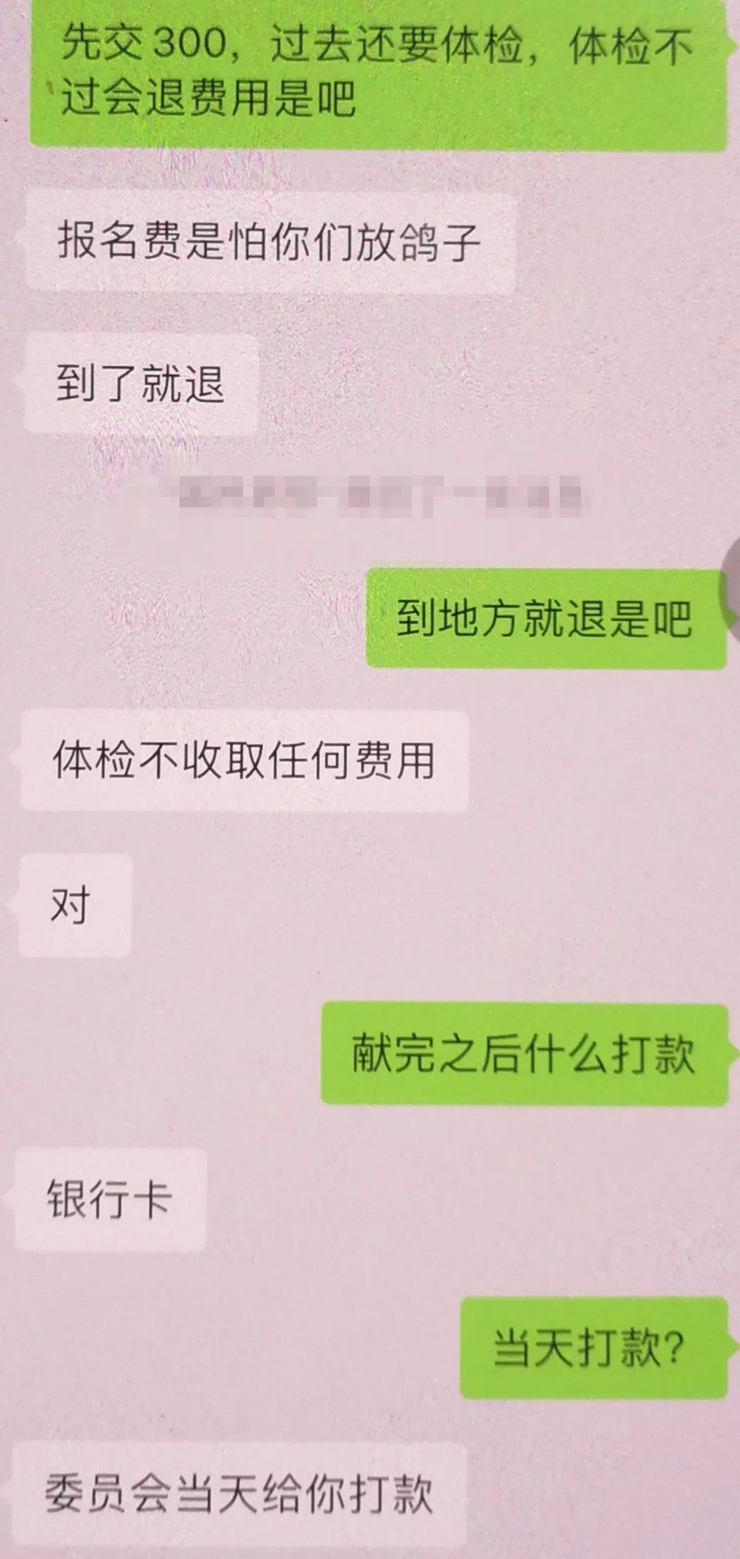 “对方表示要想有偿献血就得先交押金,如果体检不达标无法献血,承诺包退押金,还能报销往返打车费用。”小李思索再三,为了这几千元的营养金,最终向对方汇去了押金。