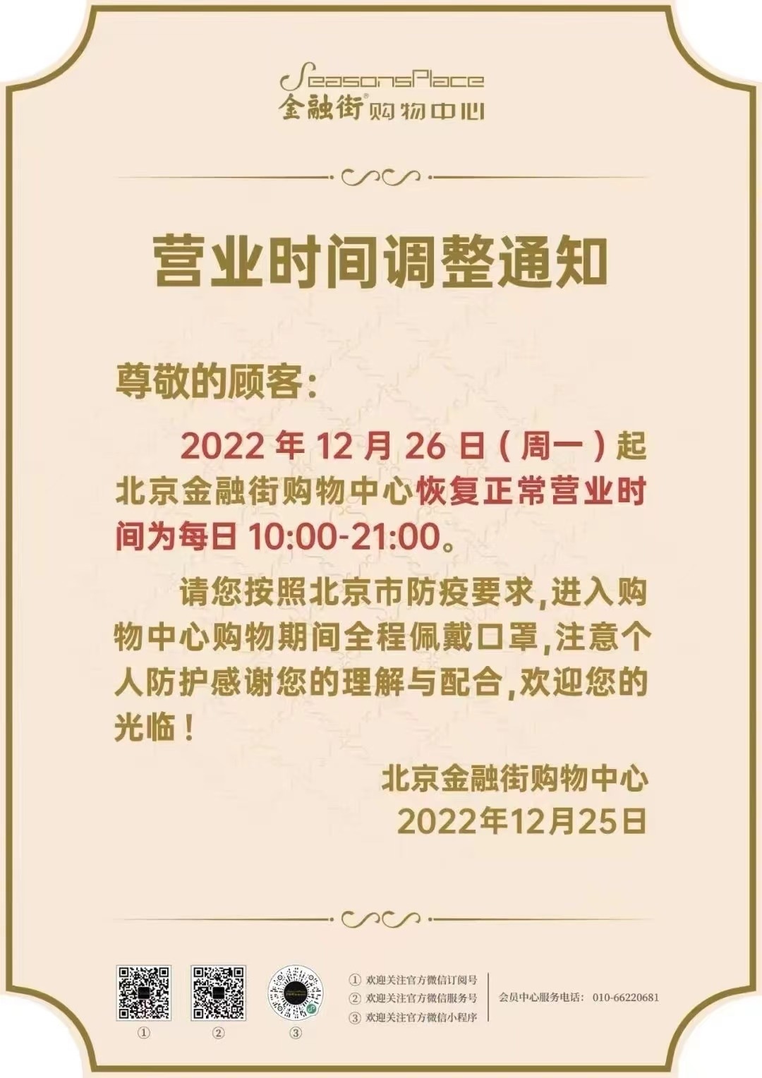 3. 12月26日起,北京金融街购物中心恢复正常营业