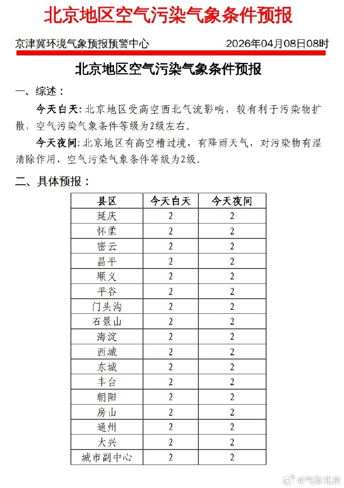 4月8日上午发布今天白天到今天夜间北京地区 #空气污染气象条件预报#
