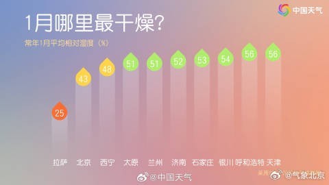 冬季天干物燥,大范围“干得发红”,北京1月的干燥程度也是“榜上有名”。日常请及时补水,并注意用火用电安全,谨防火灾发生。