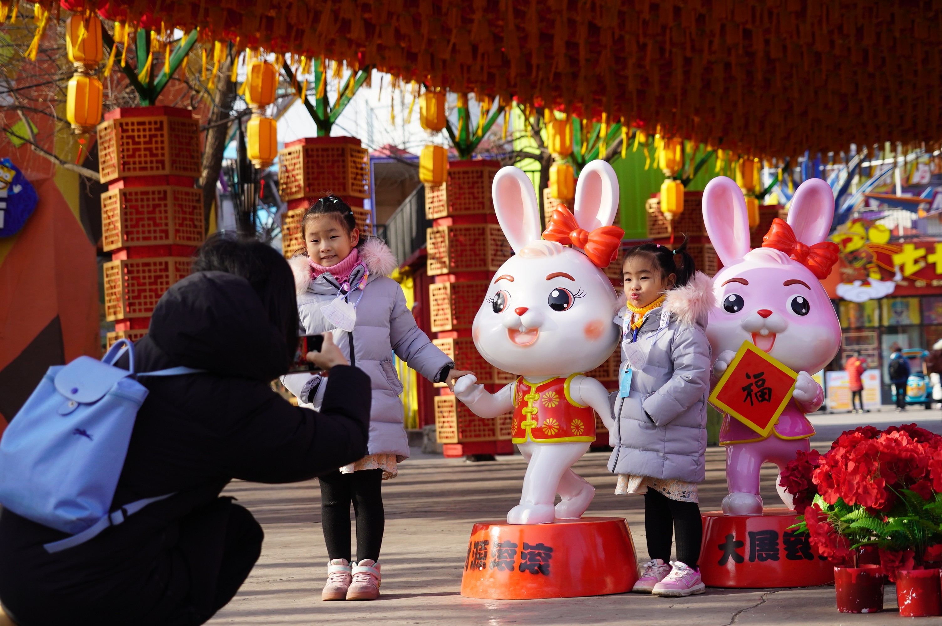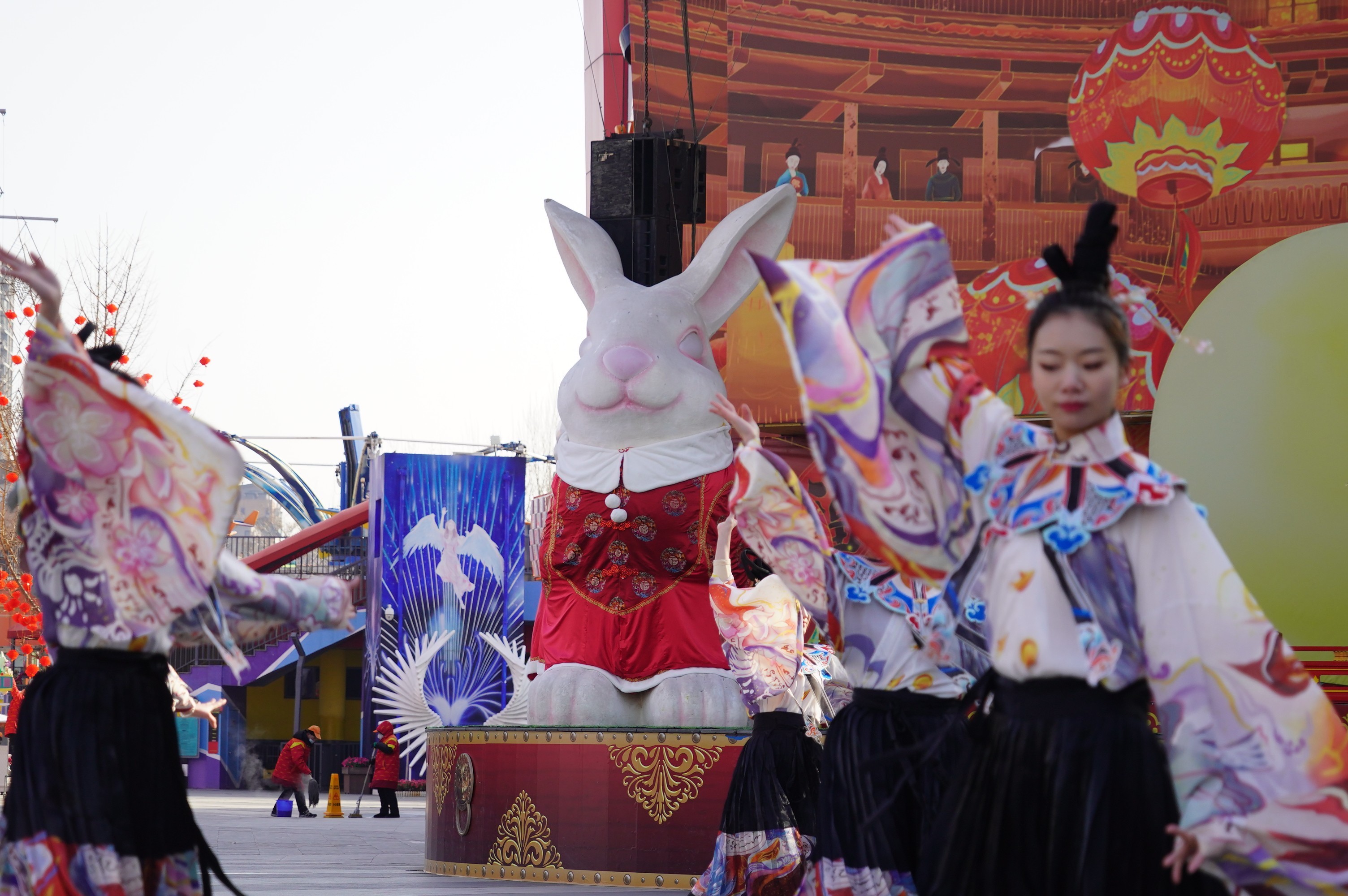 春节期间,游客能看见中央广播电视总台2023年春节联欢晚会吉祥物“兔圆圆”,还能把“兔团团”“兔圆圆”文创产品带回家。记者在现场看到,园区入口处成为拍照打卡胜地,“兔圆圆”最为显眼,红彤彤的灯笼等新春装饰带来了喜庆氛围。