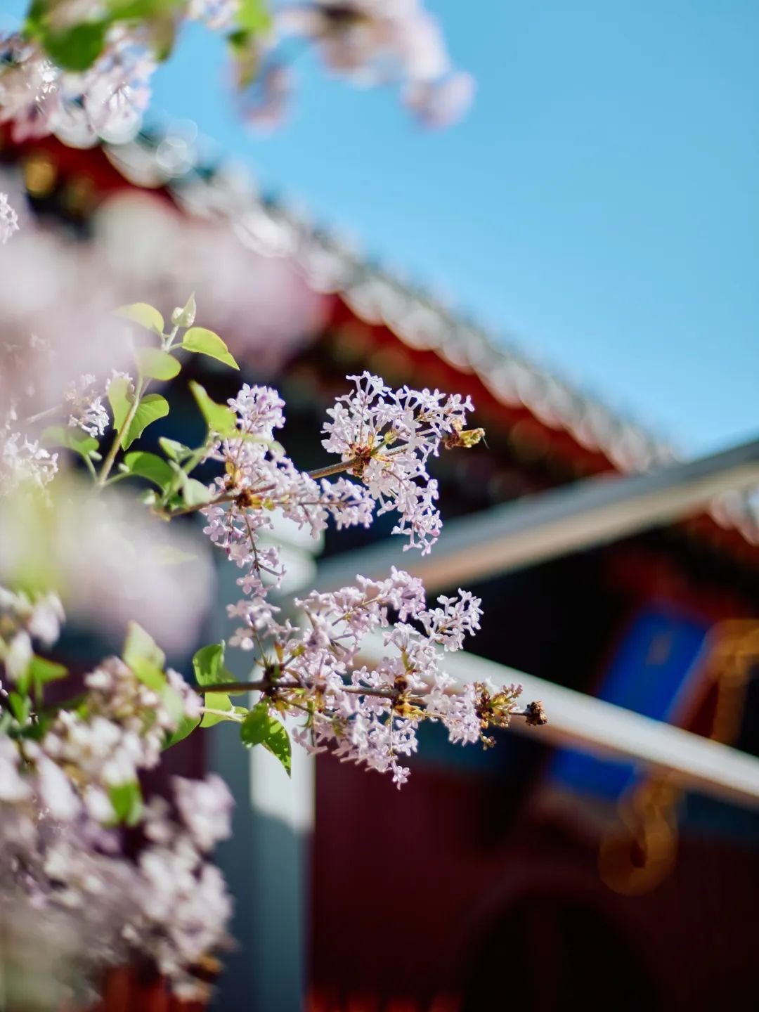 4月正是这里的盛花期,紫玉兰、白玉兰清丽脱俗,禅香与花香交织。梨花映红墙,丁香漫回廊。金黄花枝翘立,点缀古建角落,增添生机。