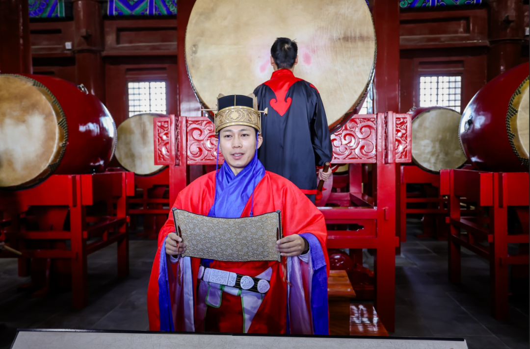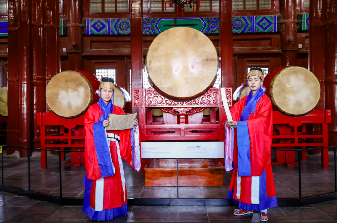 根据《大明会典》《明礼集》等相关史料为基础,展现古代击鼓鸣钟仪式,守正创新,加入节气文化活动包含漏刻博士报时,司晨唱时,击鼓表演,三个环节。