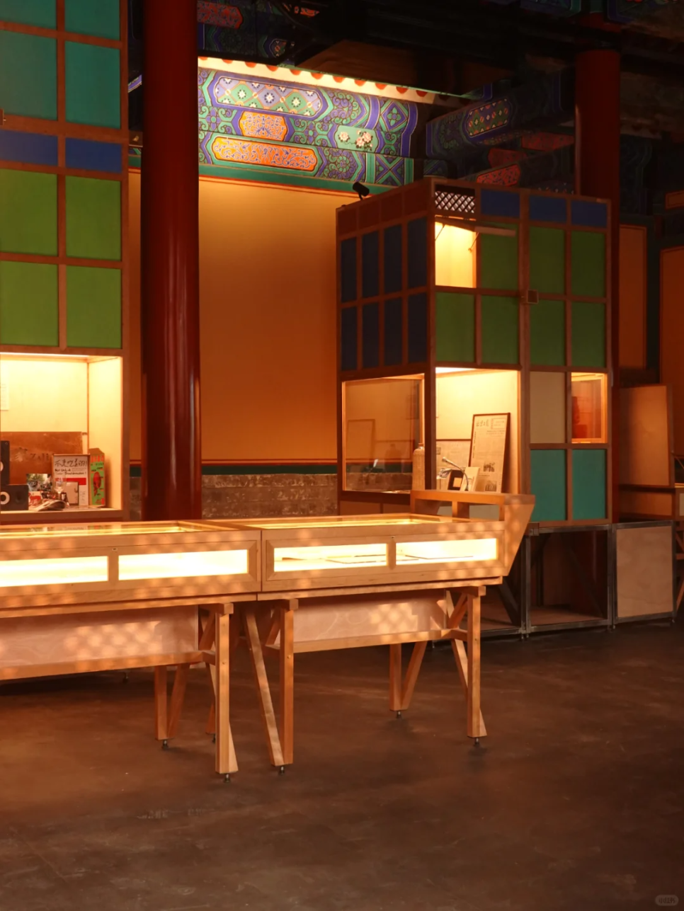 作为博物馆核心的观·书殿,由宏恩观正殿“帝君殿”改造而成。金丝楠木梁柱静立如初,仰首可见清代皇家最高等级的和玺彩绘——金龙盘踞藻井,青绿祥云流转梁间。殿内陈列中轴线主题文创,游客可倚坐蒲团阅读,于古建中感受古今交织的静谧。