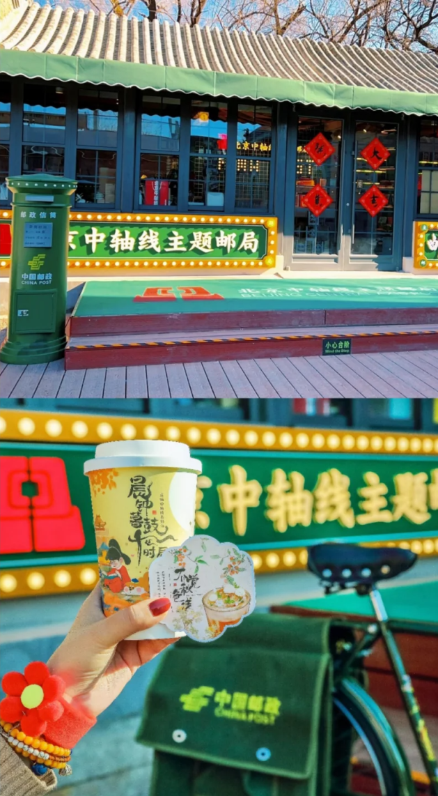 中轴线主题邮局,门口绿色邮筒与“二八”自行车,定格旧时光。邮局限定明信片可盖中轴线建筑邮戳,饮品吧台的热饮杯印着京城历史中轴线全景,方寸之间解码北京城的文化基因。