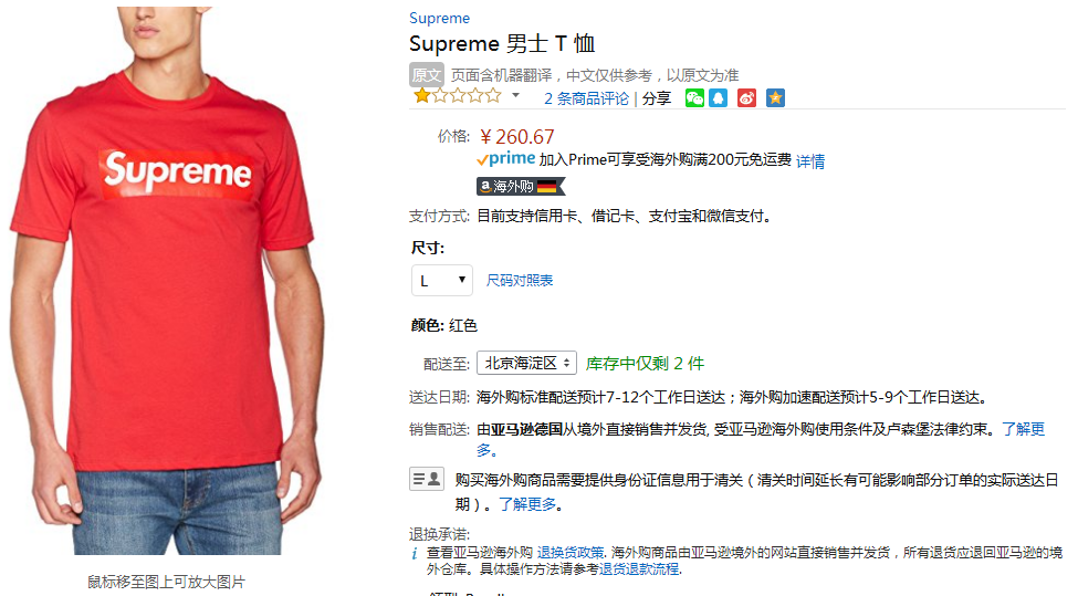 近日,@时间测评登录亚马逊海外购网站发现,陈先生购买的一件T恤还在销售。商品名为Supreme 男士 T 恤,价格260.67元,由亚马逊德国销售发货。