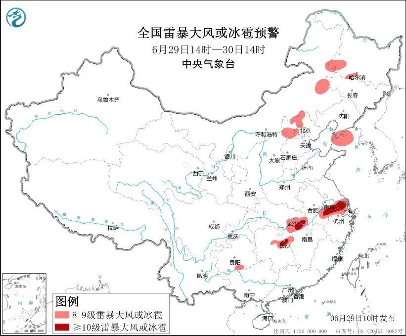 中央气象台6月29日10时继续发布强对流天气蓝色预警:预计6月29日14时至30日14时,内蒙古东部、黑龙江西南部、河北西北部、北京西部和北部、辽宁南部、湖北东南部、安徽东南部、江苏南部、贵州南部、湖南中东部、江西西北部等地的部分地区将有8级以上雷暴大风或冰雹天气,其中,湖北东南部、安徽东南部、江苏南部、湖南东北部等地的部分地区将有10级以上雷暴大风。