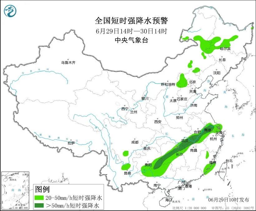 内蒙古中东部、黑龙江西南部和中部、吉林西北部、山西东北部、河北西北部、北京西部、安徽南部、江苏南部、上海、湖北东部、湖南中部和东北部、江西北部、福建东南部和北部、四川南部、贵州南部、云南东北部、广西北部等地的部分地区将有小时雨量大于20毫米的短时强降水天气,其中,安徽南部、江苏西南部、湖北东南部、湖南中部和东北部、贵州东南部等地的部分地区将有小时雨量大于50毫米,最大可达70毫米以上。
